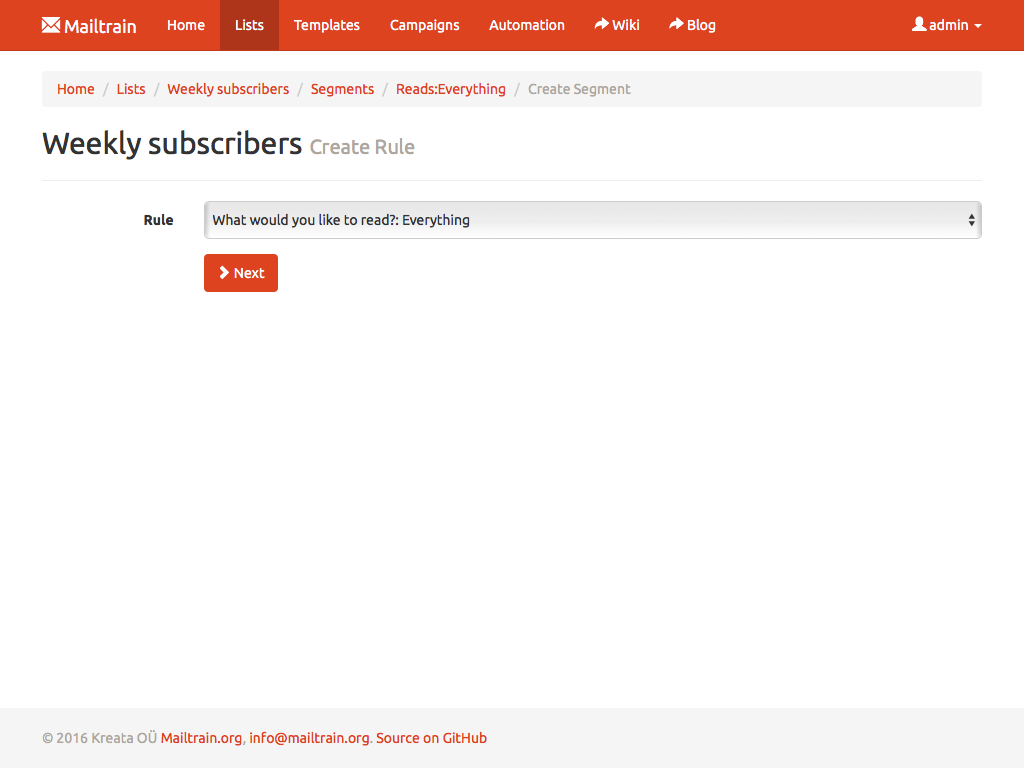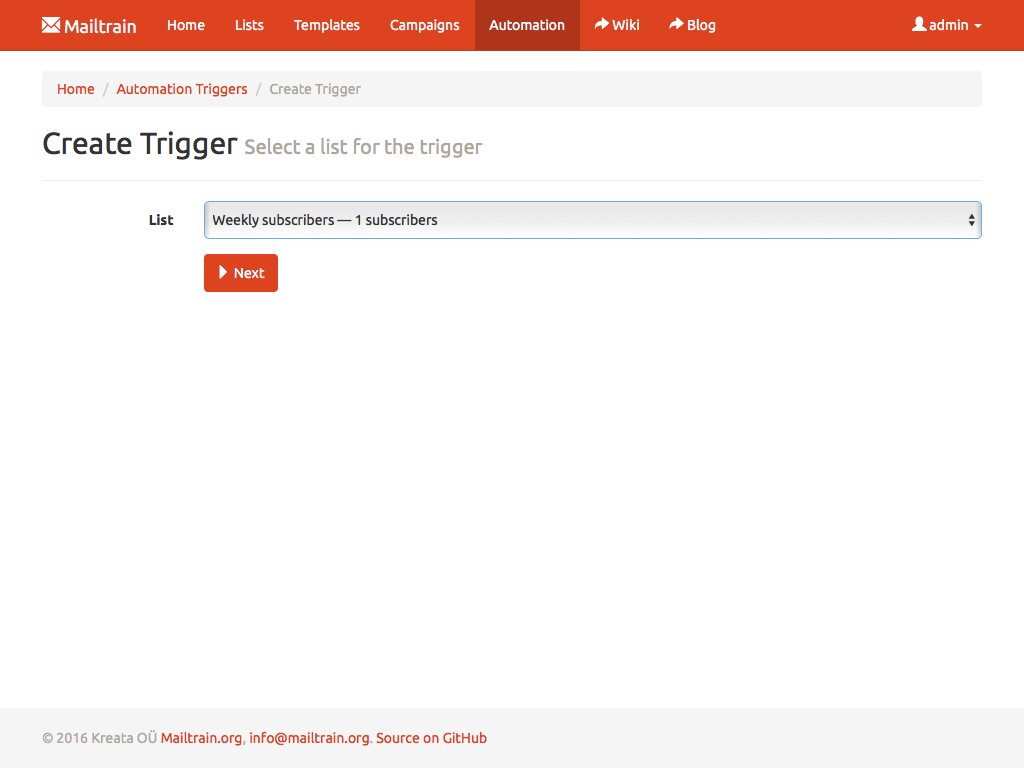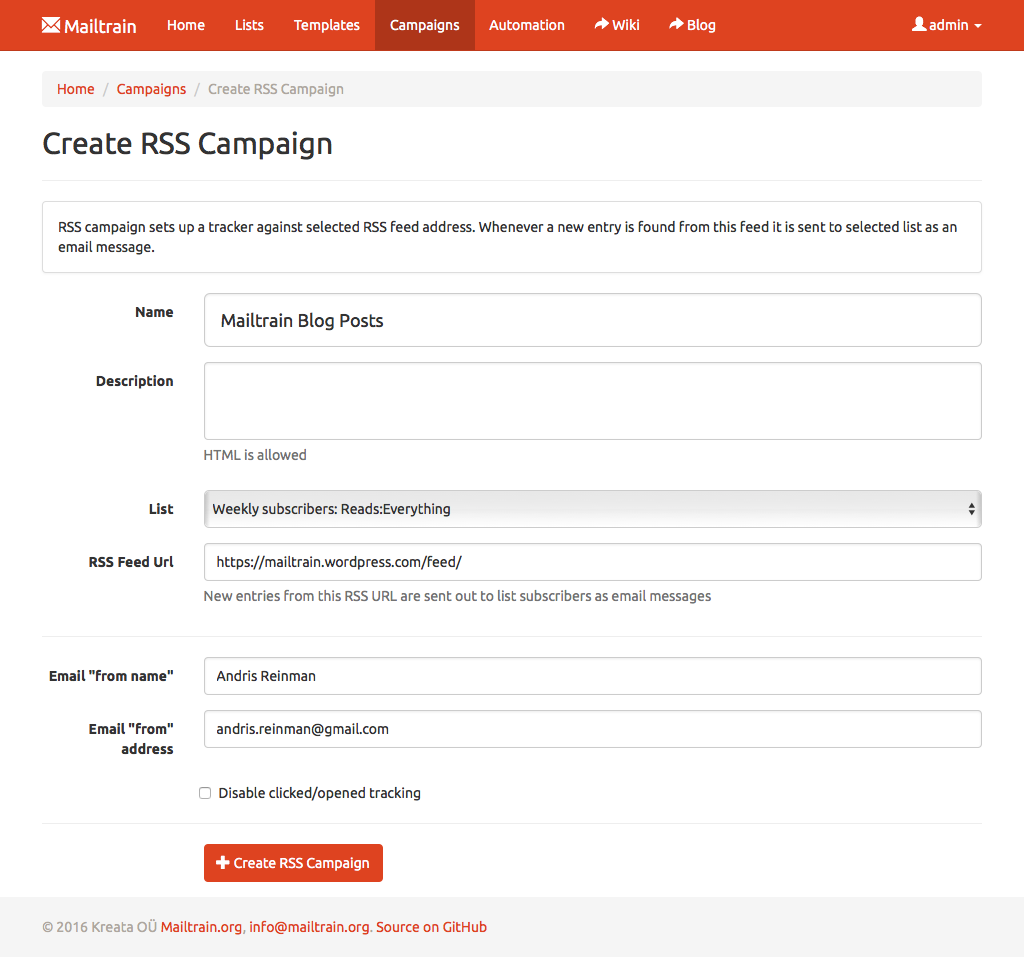 Configura Mailtrain para seguir el Fedd de RSS y si se detecta una nueva entrada del feed, Mailtrain generará automáticamente una nueva campaña a partir de los datos de la entrada como contenido del mensaje y lo enviará a los suscriptores seleccionados.