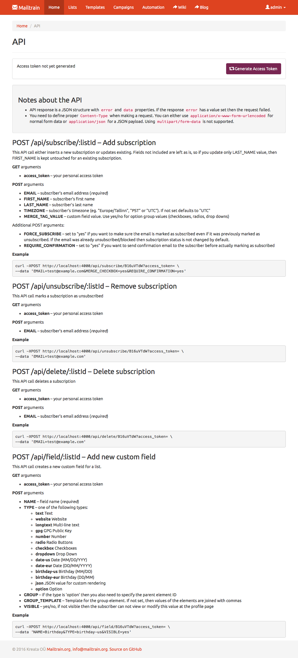Mailtrain le permite administrar fácilmente listas muy grandes. ¿Millones de suscriptores? No es un problema. Puede añadir manualmente los suscriptores, a través de la API o importación de un archivo CSV. Todas las listas vienen con soporte para los campos personalizados y se fusionan las etiquetas también.
